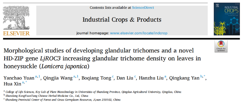 近日,yzcca88登录官网辛华教授课题组在农林科学领域一区、Top期刊《Industrial Crops and Products》上发表了题为“Morphological studies of developing glandular trichomes and a novel HD-ZIP gene LjROC3 increasing glandular trichome density on leaves in honeysuckle (Lonicera japonica)”的研究成果。该研究观察了金银花茎和叶上腺毛的形态结构、类型及分布特征,并筛选鉴定了参与腺毛密度调控的LjHD-ZIP基因(LjROC3和LjHD-ZIP1)。
