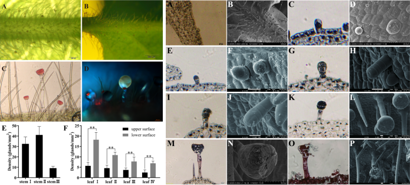 图1 金银花茎叶表面腺毛密度及不同发育阶段形态特征