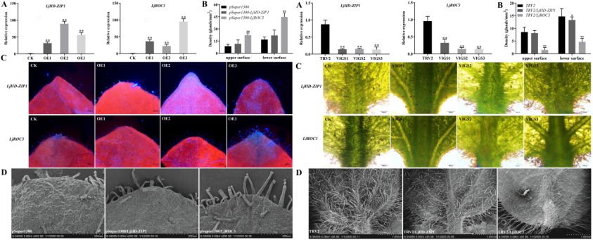 本研究首先观察了金银花茎叶表面GTs的分布(图1左):在叶表面,GTs主要沿主叶脉分布,从基部到顶端逐渐减少,并且其密度随着叶片的发育而逐渐降低;GTs在茎表面均匀分布,且其密度随着茎的发育先升高后降低。然后,用扫描电镜和石蜡切片观察了GTs的形态结构、类型及发育过程(图1右),首次发现金银花中所有GTs都含有多个细胞形成的圆盘状基座,并将其命名为圆盘基座头状GTs。本研究还鉴定和比较了两个HD-ZIP基因-LjROC3和LjHD-ZIP1的功能(图2):在GTs发育过程中,这两个HD-ZIP基因都显著上调,LjROC3的异源过表达和VIGS沉默植株中GTs密度分别显著增加和降低,而LjHD-ZIP1的转化株系没有显著差异。这些结果将为及时采摘高代谢产物药材、探索金银花叶片GTs发育的调控机制和培育高GTs密度新品种提供有价值的参考。