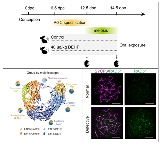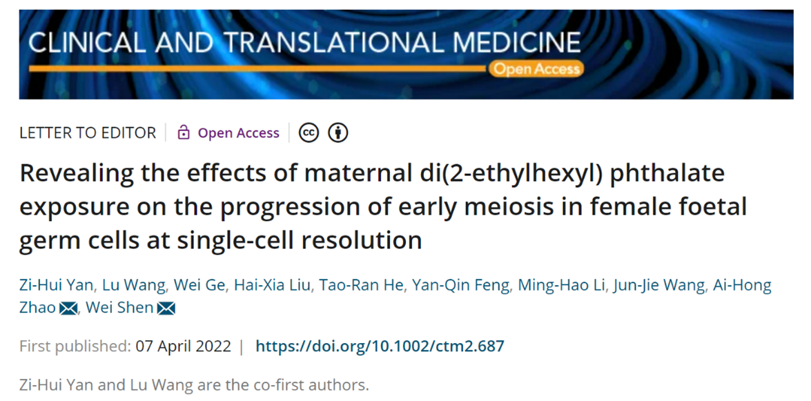 近日,yzcca88登录官网沈伟教授课题组在中科院一区、TOP期刊《Clinical and Translational Medicine》(IF=11.492)上发表研究论文“Revealing the effects of maternal Di (2-ethylhexyl) phthalate exposure on the progression of early meiosis in female fetal germ cells at single-cell resolution”,该论文通过单细胞技术揭示了塑化剂邻苯二甲酸酯(DEHP)经母体影响胎儿雌性生殖细胞早期减数分裂进程的分子机制。