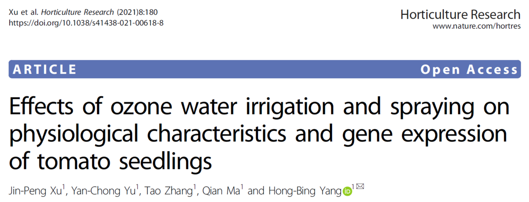 9月1日,yzcca88登录官网杨洪兵课题组在Horticulture Research(中科院1区Top期刊,IF 6.793)在线发表了题为“Effects of ozone water irrigation and spraying on physiological characteristics and gene expression of tomato seedlings”的研究论文,探讨了臭氧水施用适宜浓度及其改善番茄生理特性的机制。学院硕士研究生徐金鹏和于延冲副教授为该论文并列第一作者,杨洪兵教授为通讯作者,张弢副教授和马倩副教授为共同作者。