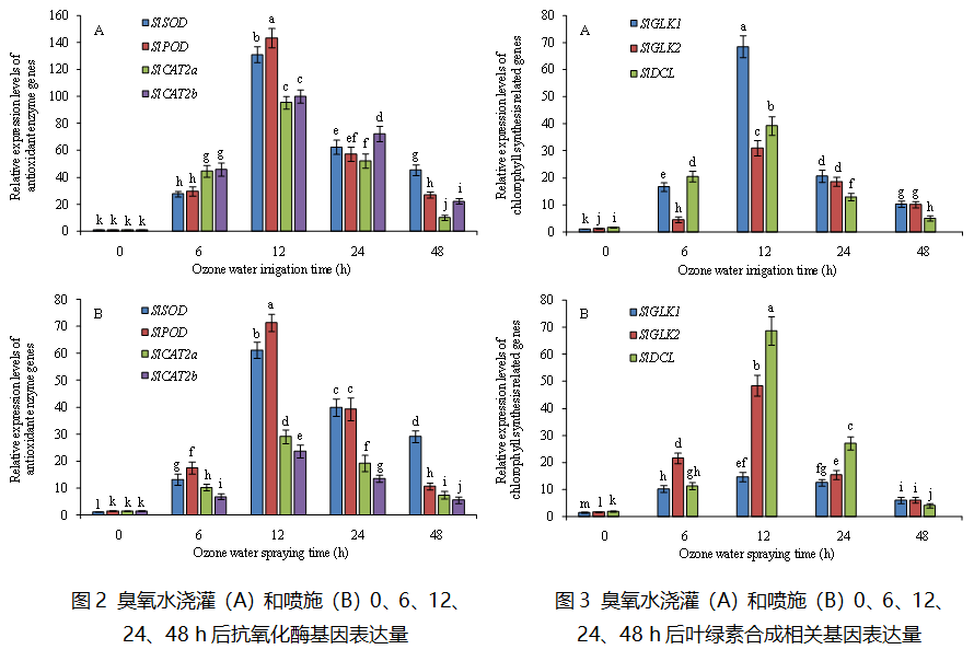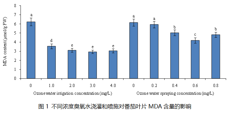 臭氧是一种天然强氧化剂和杀菌剂,具有广谱、高效、无残留等特点,已在工业、医学、农业等领域得到广泛应用。臭氧溶于水后部分臭氧分子结合水分子生成氧化性更强的基团,故臭氧水具有更强的氧化性。虽然臭氧水在农业生产中应用前景广阔,但臭氧水对植物生理特性及基因表达的影响在很大程度上仍不清楚。为了充分发挥臭氧水优势,避免其对植物产生氧化损害,课题组采用不同浓度臭氧水浇灌和喷施番茄,发现施用适宜浓度臭氧水能提高番茄抗氧化酶活性并降低丙二醛(MDA)含量,同时促进抗氧化酶基因表达,说明施用适宜浓度臭氧水能明显提高番茄抗逆性;施用适宜浓度臭氧水还能提高番茄SPAD值和氮含量,促进叶绿素合成相关基因及氮素吸收相关基因表达,有利于提高番茄光合能力和产量。臭氧水浇灌和喷施适宜浓度分别为3.0 mg/L和0.6 mg/L,且臭氧水浇灌效果明显好于喷施处理。