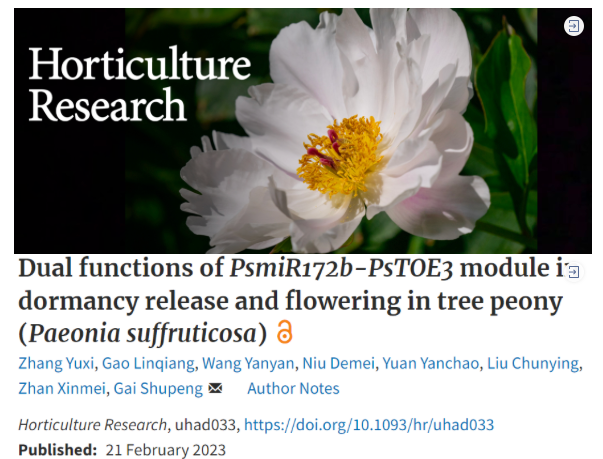 近日,yzcca88登录官网盖树鹏团队在农林科学领域一区、Top期刊《Horticulture Research》上发表了题为“Dual functions of PsmiR172b-PsTOE3 module involving in regulation dormancy release and flowering in tree peony (Paeonia suffruticosa)”的研究成果。该研究从microRNA对靶基因调控的角度,解析了PsmiR172与靶基因PsTOE3调控牡丹芽休眠解除和开花的双重功能。