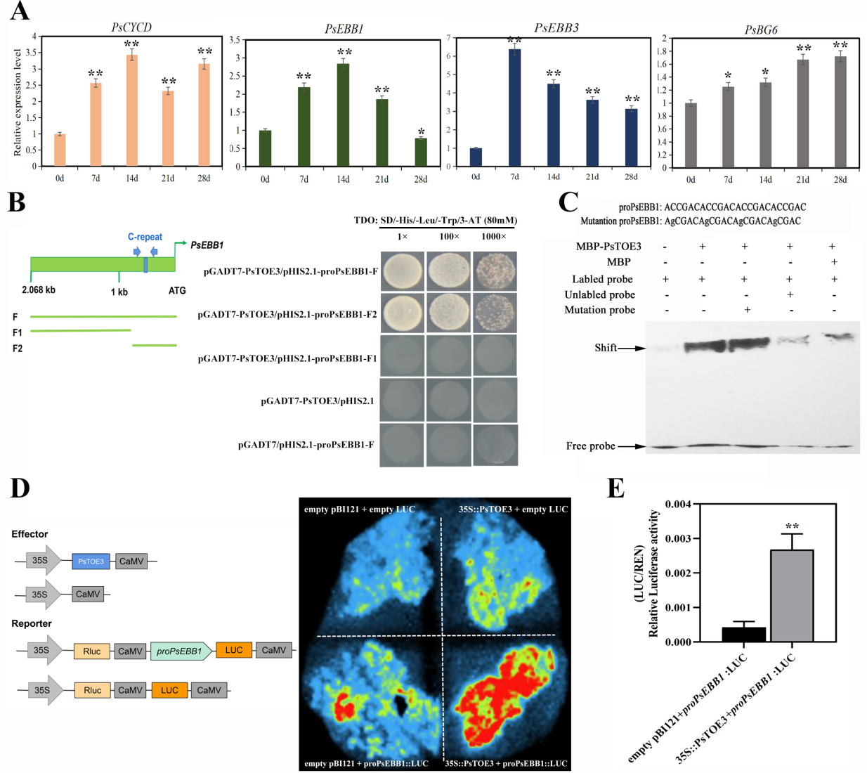 图2 PsTOE3直接结合并促进PsEBB1的表达