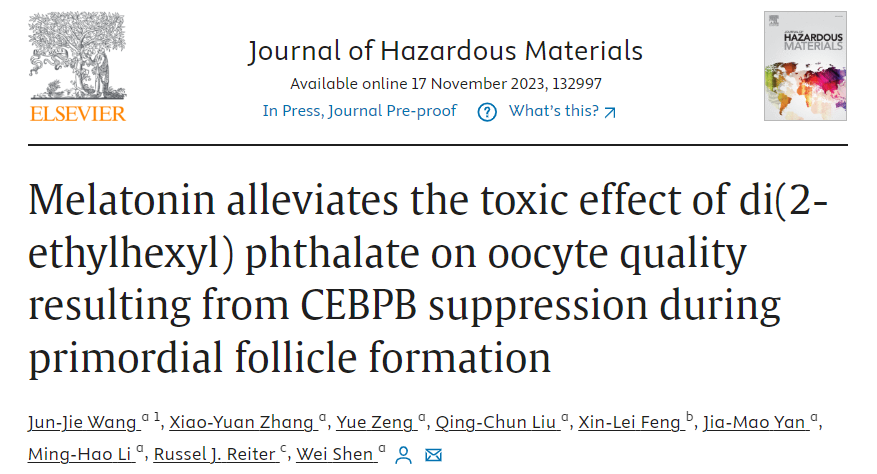 近日,yzcca88登录官网沈伟教授课题组在动物卵母细胞发育方面取得重要进展,相关成果以“Melatonin alleviates the toxic effect of di(2-ethylhexyl) phthalate on oocyte quality resulting from CEBPB suppression during primordial follicle formation”为题,在线发表于《Journal of Hazardous Materials》(一区top期刊,IF=13.6)杂志上。