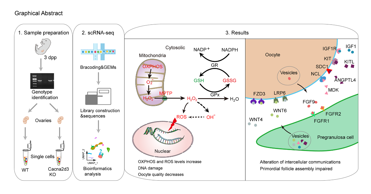 程顺峰课题组发现,敲除Cacna2d3基因会导致原始卵泡形成受损,同时降低小鼠生育能力。研究发现,敲除Cacna2d3基因会下调卵母细胞和前颗粒细胞中昼夜节律基因(Clock、Per3、Cry1、Nr1d2、Rorc、Bhlhe41)的表达水平,上调氧化磷酸化信号通路(OXPHOS)相关基因的表达,造成细胞DNA损伤。此外,借助CellChat技术发现,敲除Cacna2d3改变卵母细胞和前颗粒细胞之间的细胞通讯信号模式,并显著降低相互作用强度,特别是Kitl-Kit配受体信号,进而使卵母细胞受损。