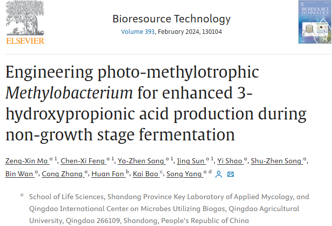 近日,yzcca88登录官网山东省应用真菌重点实验室微生物资源与功能产物合成科研团队在一碳转化领域获得新突破,相关成果以“Engineering photo-methylotrophic Methylobacterium for enhanced 3-hydroxypropionic acid production during non-growth stage fermentation”为题,发表在生物工程领域知名期刊Bioresource Technology (影响因子11.4,中科院1区)。