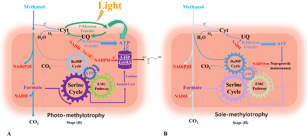 一碳气体减排和资源化利用是实现“双碳”目标的核心,目前串联两步法成为一碳化合物高值化重要思路。首先绿“电”制氢还原二氧化碳合成甲醇,进而利用合成生物学技术将甲醇通过微生物细胞工厂转化为医药食品和精细化学品等高值产品。扭脱甲基杆菌(Methylorubrum extorquens)是有机一碳细胞工厂的模式底盘之一,然而其在非生长生产阶段存在代谢能力弱化、能量供给不足的“卡脖子”问题,制约高效合成化学品。杨松科研团队提出构建光合甲基营养型细胞工厂的创新策略,利用基因组尺度代谢通量分析、基因敲除表达、代谢组及转录组分析等手段,有效激活甲基杆菌天然光合基因簇表达,显著提高了胞内细菌叶绿素和能量水平。光合甲基营养工程菌大幅延长了非生长生产阶段的生产周期,有效增强了耗能生物基化学品3-羟基丙酸合成效率,为有机一碳高效转化成生物医药品化学品提供一种全新思路。