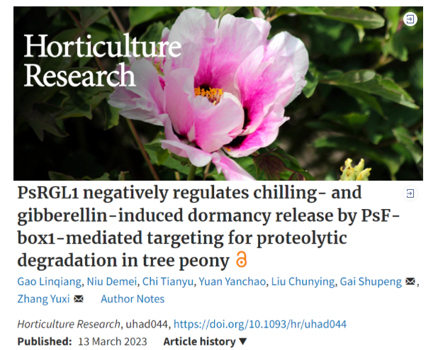 近日,yzcca88登录官网盖树鹏团队在农林科学领域一区、Top期刊《Horticulture Research》上发表了题为“PsRGL1 negatively regulates chilling- and gibberellin-induced dormancy release by PsF-box1-mediated targeting for proteolytic degradation in tree peony”的研究成果。该研究从GA信号调控的角度,解析了GA信号的负调控因子参与牡丹芽休眠解除的分子机制。