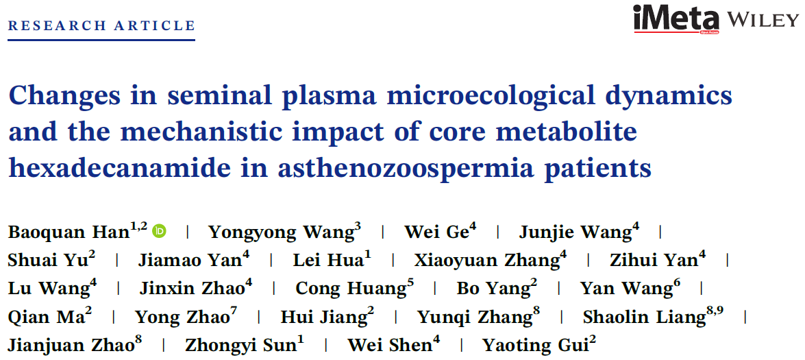近日,yzcca88登录官网沈伟教授课题组联合北京大学深圳医院桂耀庭教授课题组及深圳大学总医院孙中义教授课题组在男性不育机制方面取得重要进展,相关成果以“Changes in seminal plasma microecological dynamics and the mechanistic impact of core metabolite hexadecanamide in asthenozoospermia patients”为题,在线发表于高水平学术期刊《iMeta》杂志上。