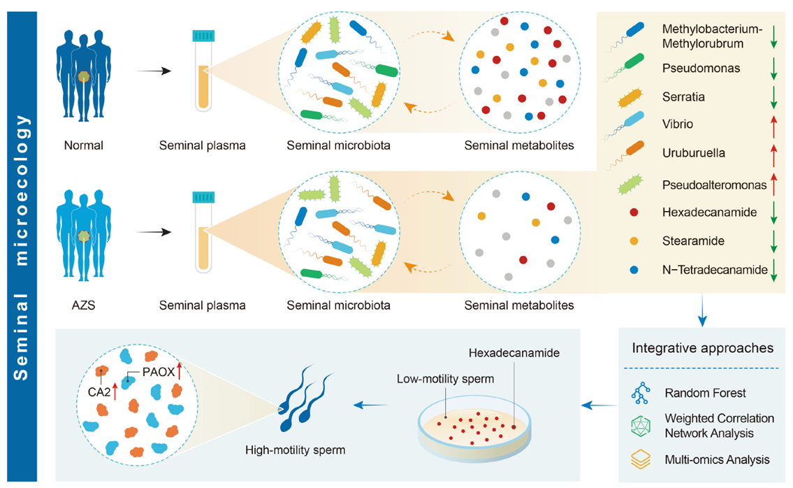 从世界范围来看,不育症的患病率约为15%,目前排名世界第三,仅次于癌症和心血管疾病。大约一半的不孕症病例归因于男性相关因素。弱精子症(AZS)是导致男性不育的一种常见病因,其特征是精子活力降低。AZS的病因是多方面的,受各种因素的影响,包括内分泌干扰物、环境压力、个人生活习惯和衰老,目前确切的原因仍不确定。新出现的经验证据表明,男性精液微生态被认为是影响夫妻生殖健康和妊娠结局的关键因素。然而,只有少数研究从不同角度探讨了精液微生态的组成和功能及其与男性不育症发展的关系。迄今为止,尚无研究对AZS患者精浆微生态变化进行全面细致的分析,包括精浆微生物群落和代谢物组成变化。