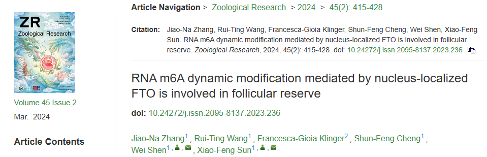 近日,yzcca88登录官网沈伟教授团队孙晓凤副教授研究组在中科院一区期刊《Zoological Research》发表题为“RNA m6A dynamic modification mediated by nucleus-localized FTO is involved in follicular reserve” 的研究论文。该论文利用转录组测序、液质联用质谱技术、基因沉默和过表达技术揭示了原始卵泡组装过程中N 6 -甲基腺嘌呤(m6A)的动态变化,RNA去甲基酶FTO在核-质中的穿梭及与卵巢储备的关系。