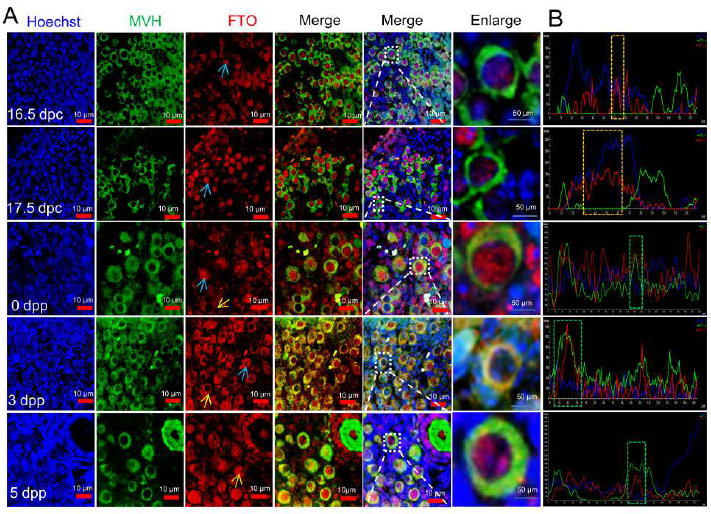 m6A是真核生物中高度保守的分布最广泛的RNA修饰,由细胞中的甲基转移酶(writer),去甲基酶(erasers)和m6A结合蛋白(reader)动态可逆性调控RNA 代谢、加工过程及RNA的稳定性,以表观遗传的方式调控一系列生命活动。孙晓凤副教授研究组在研究过程中发现:在原始卵泡组装过程中,卵巢m6A 修饰在出生当天降低到最低水平,细胞核内去甲基酶FTO的表达与m6A水平负相关,说明核定位FTO在原始卵泡组装过程中通过去甲基化作用调控m6A 水平。免疫荧光显示去甲基酶FTO在原始卵泡形成起始时特异表达于细胞核,之后随着原始卵泡组装的进行,FTO由细胞核向细胞质内穿梭,失去对m6A 的调控作用,脱离原始卵泡组装过程。FTO RNA 上有一段核定位序列,研究设计了两种过表达载体——全长Fto(核质内均过表达)和去除核定位序列Fto(仅过表达于细胞质),进一步证明核定位的FTO调控m6A修饰水平,调控原始卵泡组装;而细胞质定位的FTO无此作用。