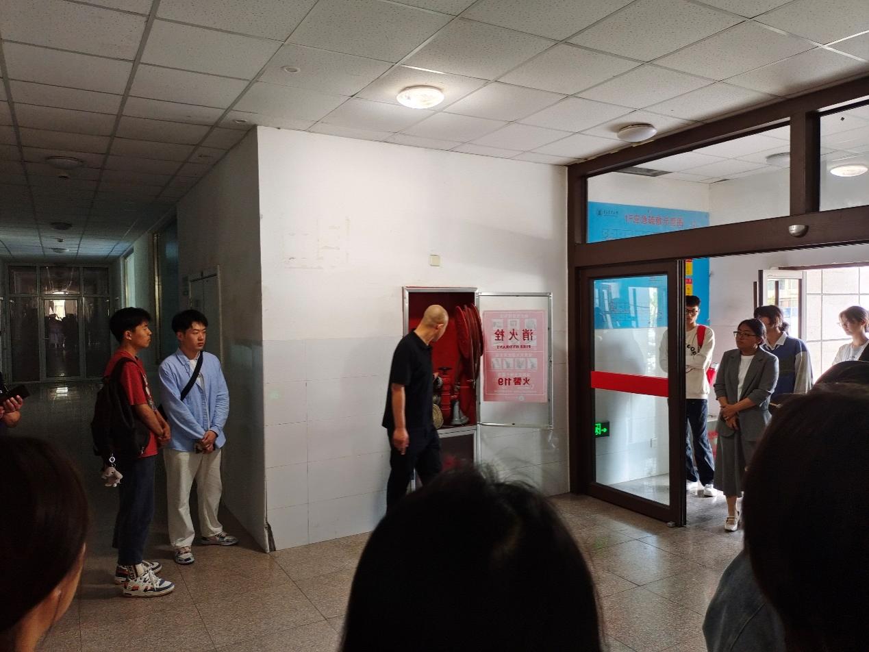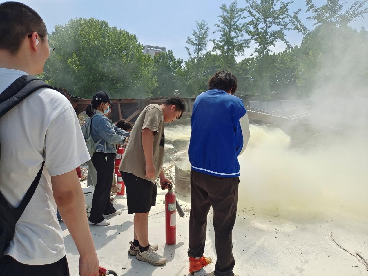 楚鹏通过实物展示、现场演示等方式,向同学们详细讲解了消防栓及灭火器的使用方法,并科普了灭火器的种类等相关消防安全知识。此外,还组织同学们上手实践使用灭火器。