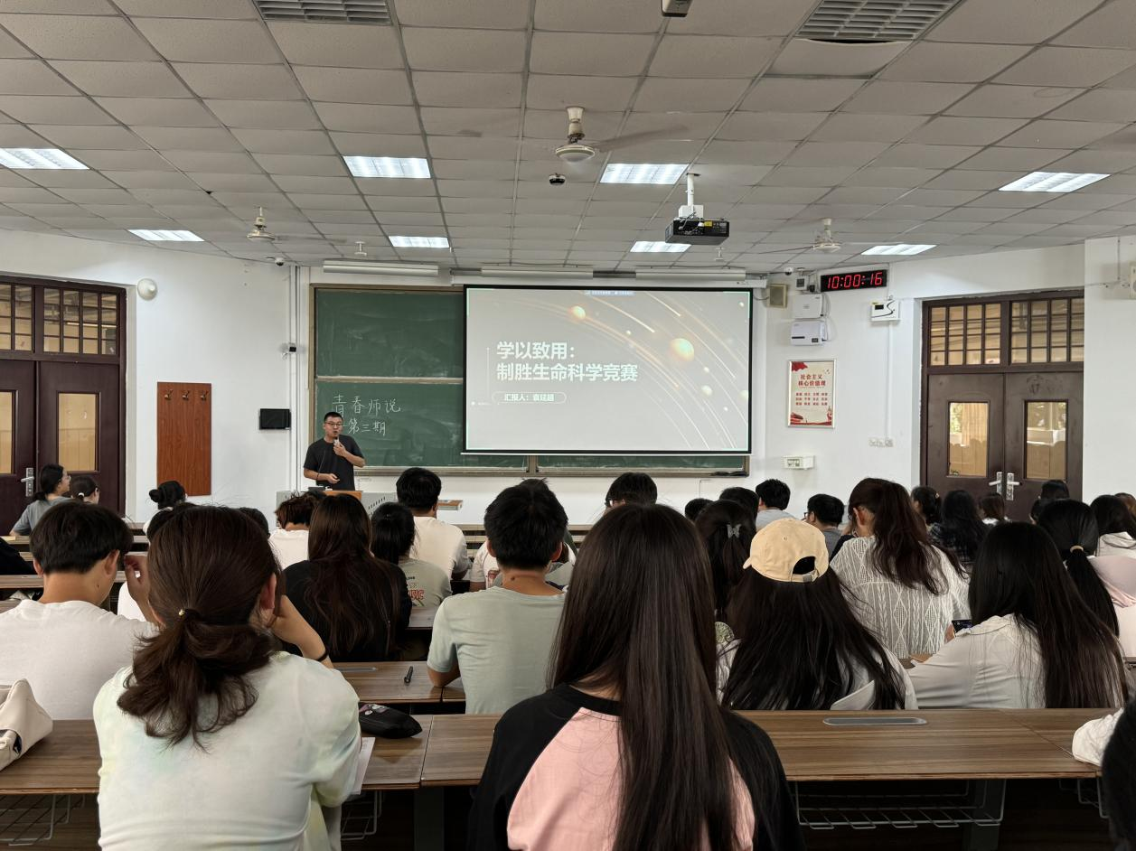 袁延超以“学以致用:制胜生命科学竞赛”为主题,以自身的科研经历与成果为例,详细介绍了生命科学竞赛的赛制流程及注意事项。他强调生命科学竞赛要求严格、赛制规范、含金量高,鼓励同学们积极参加,并对比赛期间的相关工作提出了合理建议。随后分享了现场答辩的经验,提醒同学们要注重团队合作和沟通,要有主动性和精益求精的精神。