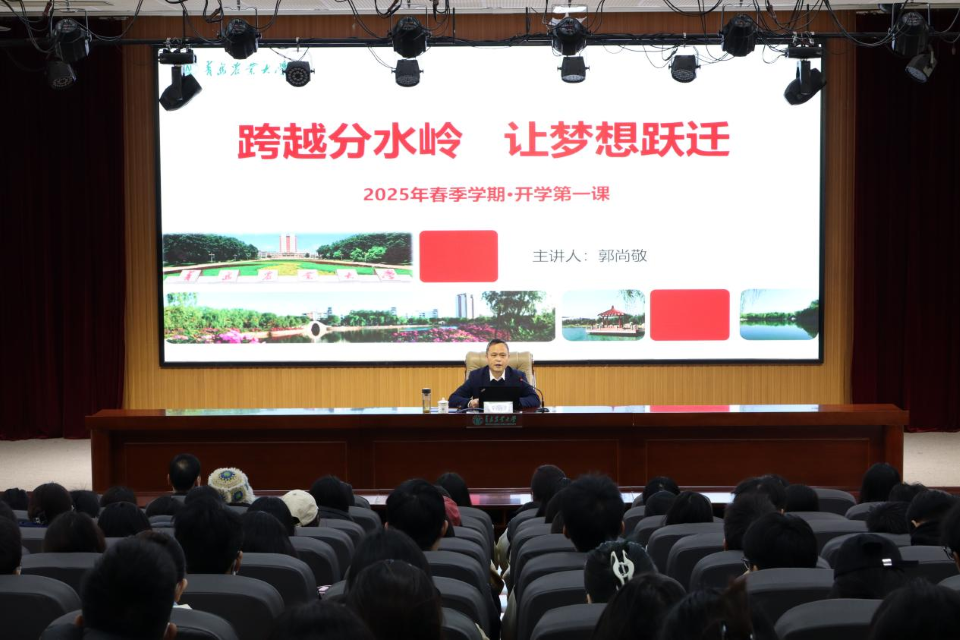 为教育引导学生牢记嘱托、砥砺奋进,积极投身中国式现代化的伟大实践。3月28日,校党委委员、副校长郭尚敬以《跨越分水岭,让梦想跃进》为题,在学术会馆第二报告厅为yzcca88登录官网和艺术学院2022级学生讲授2025年春季学期“开学第一课”。yzcca88登录官网党委书记孙景福,党委副书记、副院长刘妍玲,艺术学院党委副书记、副院长周维维以及两学院2022级带班辅导员和2022级学生参加。