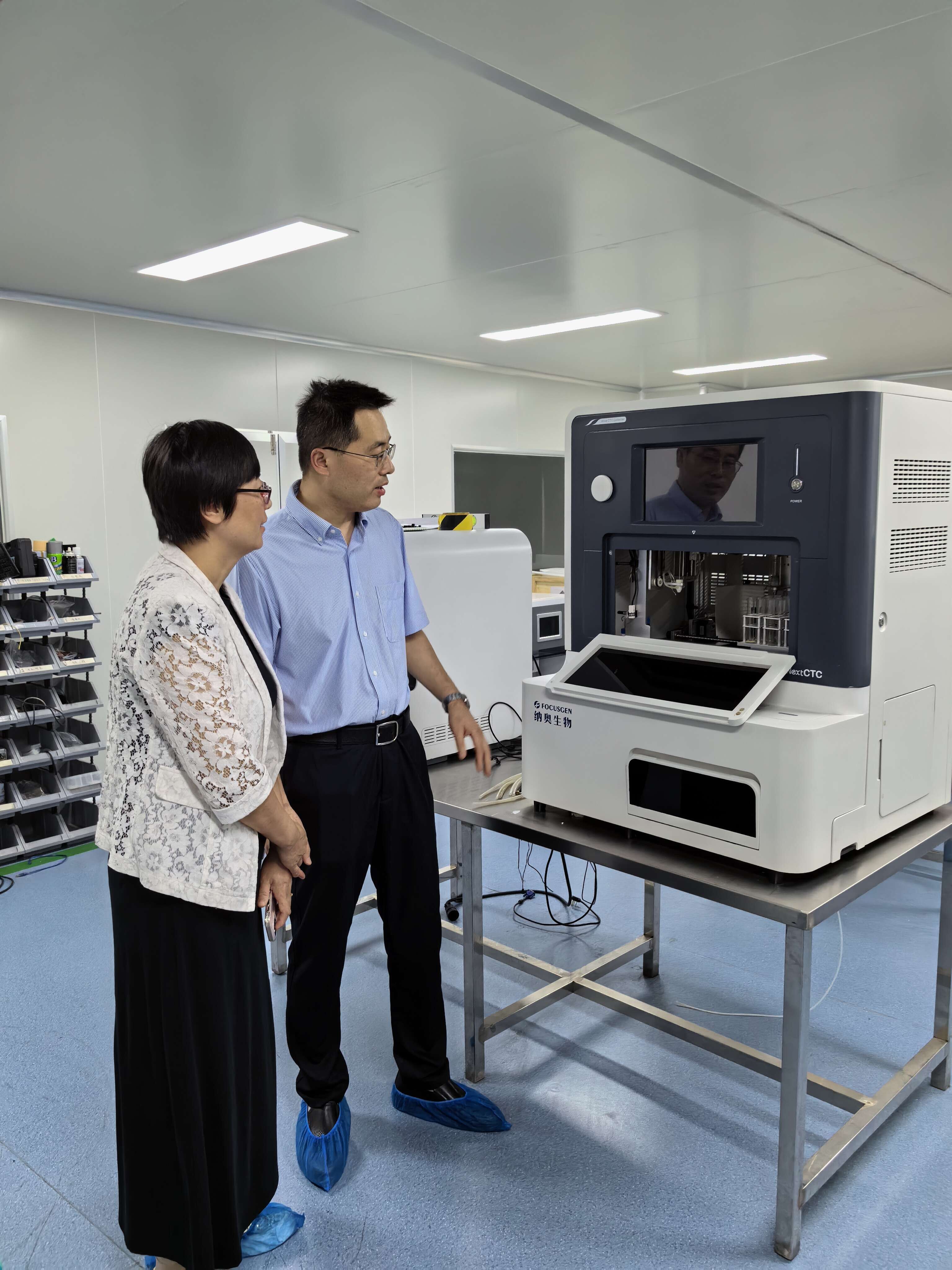 亓立峰董事长详细介绍了企业的发展历程和未来规划,带领大家参观了相关车间,并对循环肿瘤活细胞捕获仪等机械进行了详细讲解。纳奥生物是一家专注于肿瘤液体活检医疗器械和分子诊断领域的国家高新技术企业。是全国卫生产业企业管理协会精准医疗分会副会长和肿瘤诊断专委会主任委员单位,上海市专精特新中小企业。目前已成功研发、肺癌、结肠癌、口腔癌等肿瘤早期基因检测试剂盒,建立了肿瘤液体活检、个性化用药检测、分子诊断等技术平台。