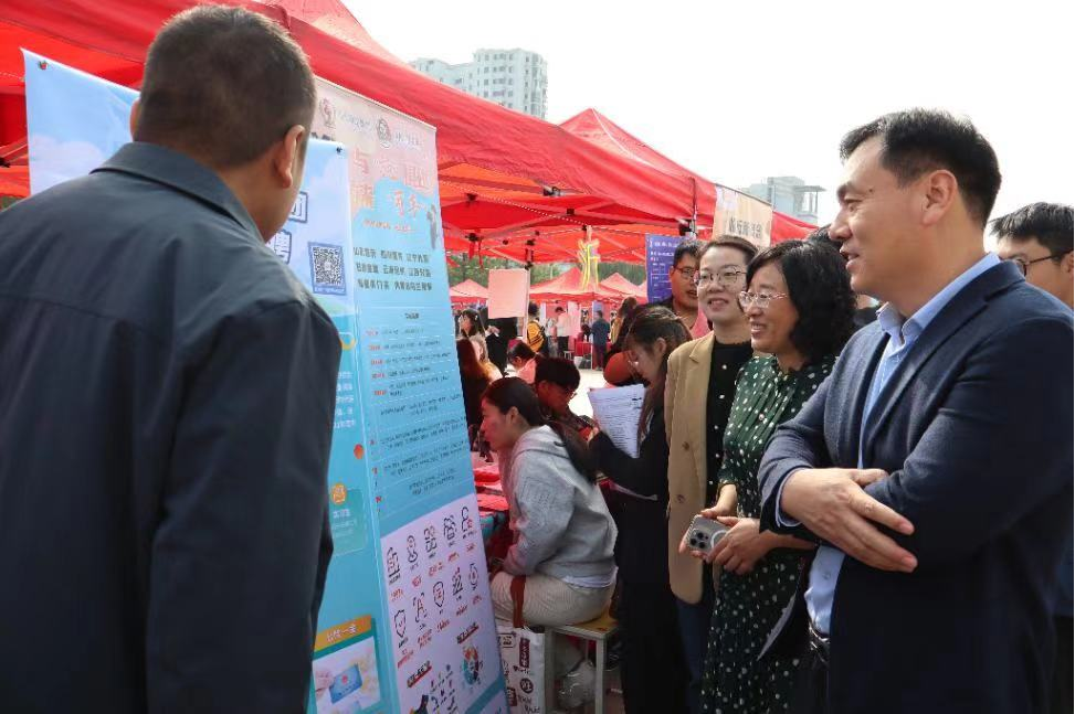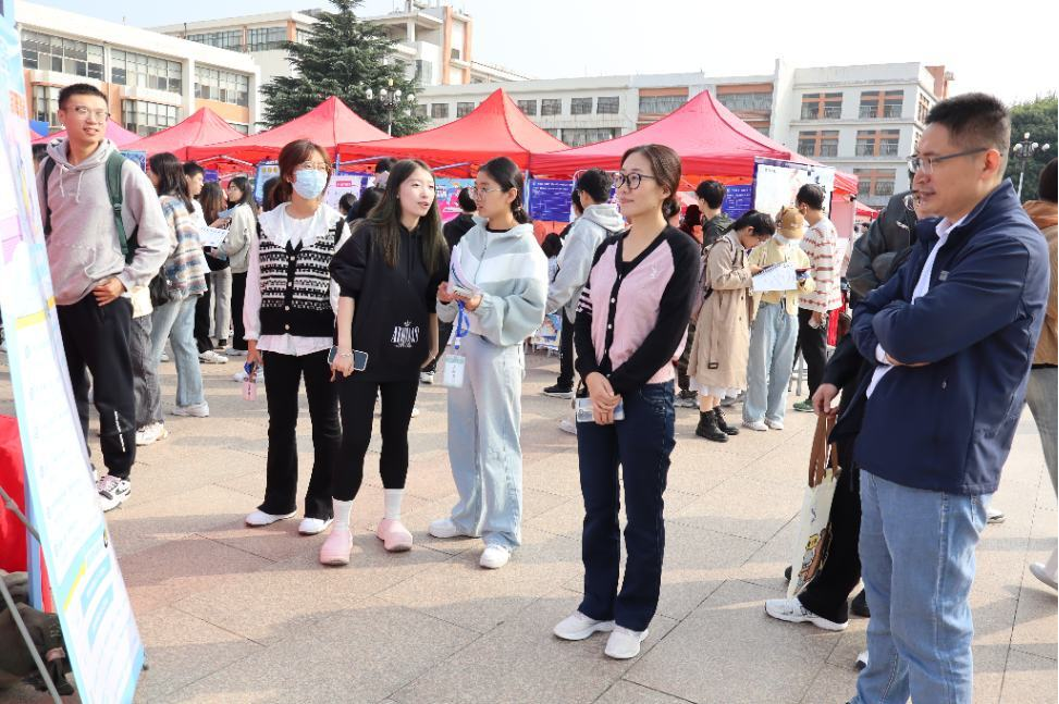 10月11日,yzcca88登录官网2025届毕业生秋季招聘会在城阳校区虹子广场举行。yzcca88登录官网党委书记孙景福,党委副书记、副院长刘妍玲,学院系主任,毕业年级辅导员王春晓及就业专项工作辅导员翟秋月到招聘现场走访交流。