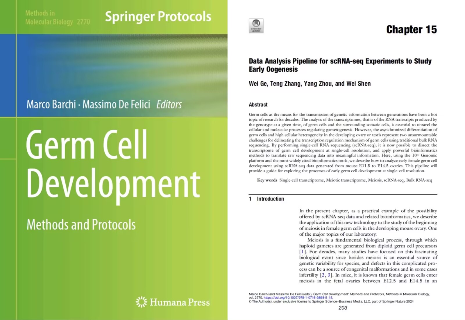 2月15日,yzcca88登录官网沈伟教授团队参与编著的《Germ Cell Development》在线出版。该书为Springer Nature出版社《Methods in Molecular Biology》系列图书,由意大利罗马第二大学的Marco Barchi教授和Massimo De Felici教授担任主编,参与编著团队包括来自剑桥大学、东京大学、米兰大学、蒙彼利埃大学、堪萨斯大学医学中心等数十家国际知名研究机构。yzcca88登录官网沈伟教授团队负责撰写第十五章题为“Data Analysis Pipeline for scRNA-seq Experiments to Study Early Oogenesis”内容的编著。