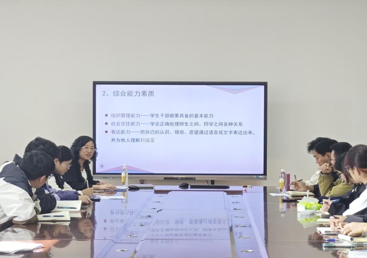 刘妍玲从学生干部的定义和作用、学生干部应具备的素质和能力、学生干部要处理好几个关系、学生干部要摆正自己的位置、学生干部要注意工作方法这五个方面讲述如何做一名优秀的学生干部。她强调,学生干部要做联系学生和老师的桥梁纽带,锚定品学兼优、德才兼备的标准,做到“双强双优”,以优秀的个人品德、出色的学习成绩、突出的工作能力、良好的人际关系,做好服务、管理工作,当好领头雁、争做排头兵。