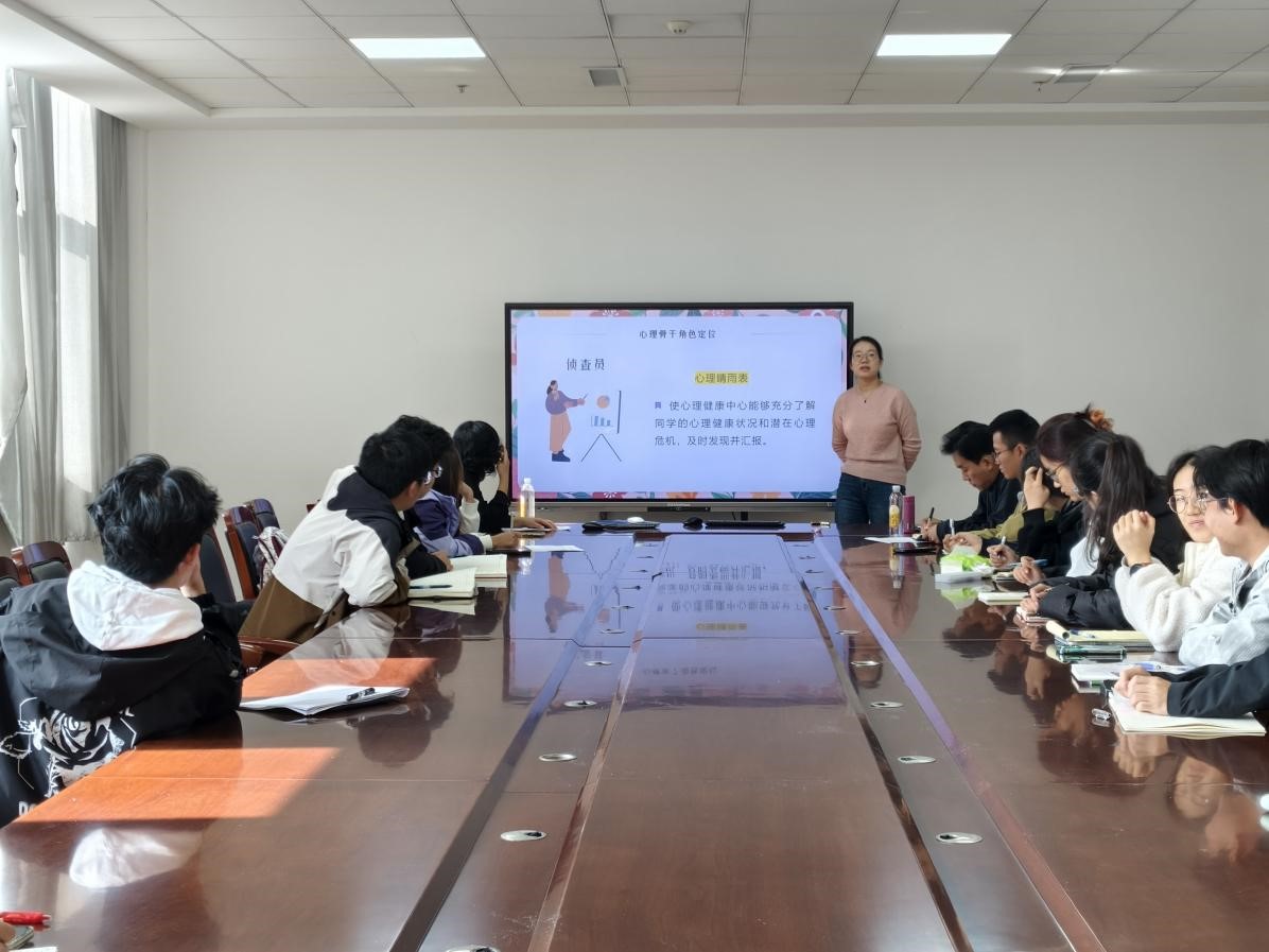 翟秋月从角色定位、工作原则、主要工作内容、识别危机信号、工作技巧五个方面对心理委员进行培训。她详细介绍了心理骨干的工作内容和工作技巧,强调心理骨干作为倾听者、侦察者、宣传者,要兼顾助人与自助,遵循保密原则和积极求助原则,更好地做好心理工作。